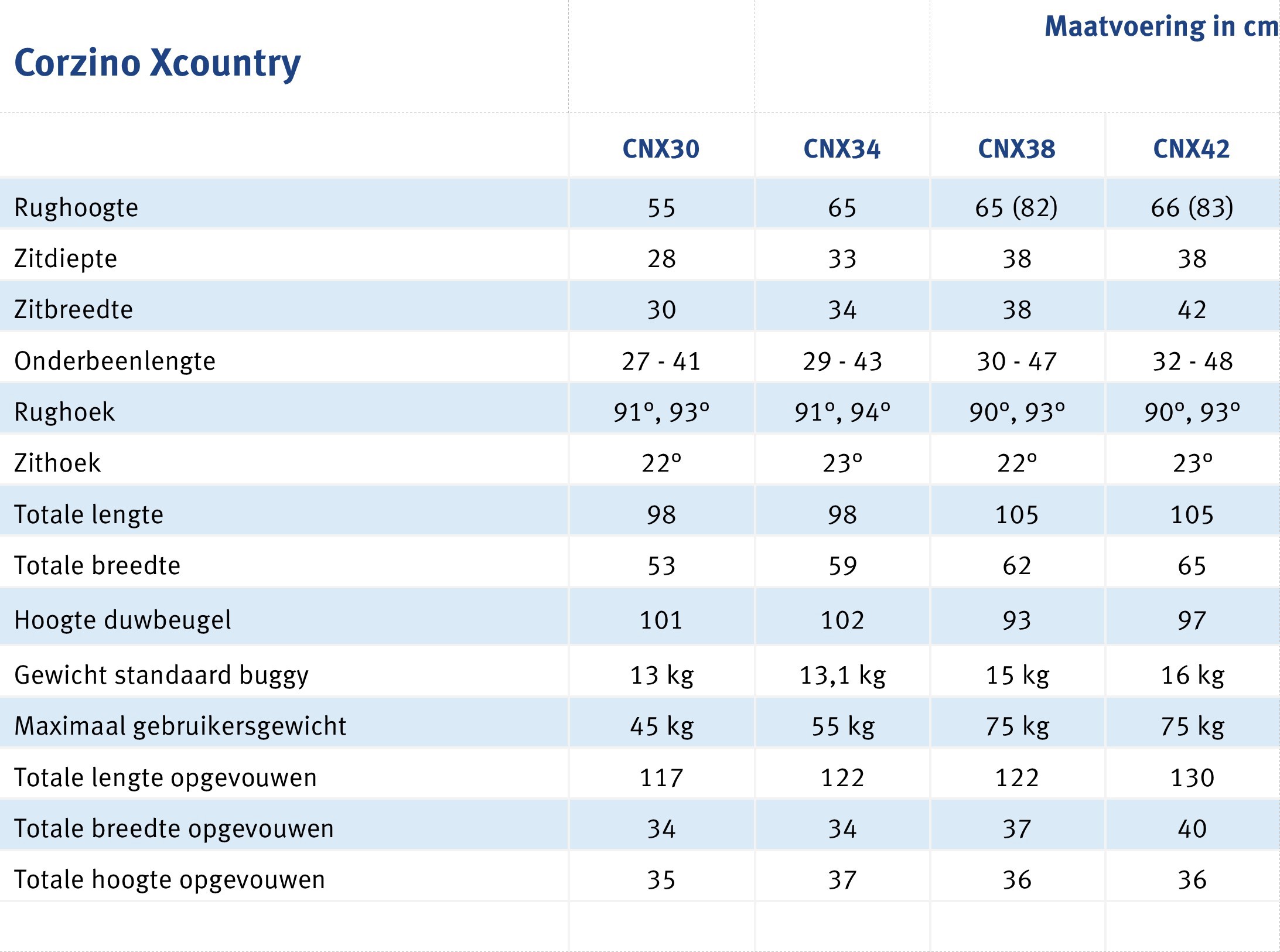 Deze buggy kan een lichaamsgewicht tot maar liefst 75 kg dragen en is uit te rusten met zeer veel accessoires. De Corzino Xcountry is verkrijgbaar in een viertal breedtematen; 30, 34,38 en 42 cm.