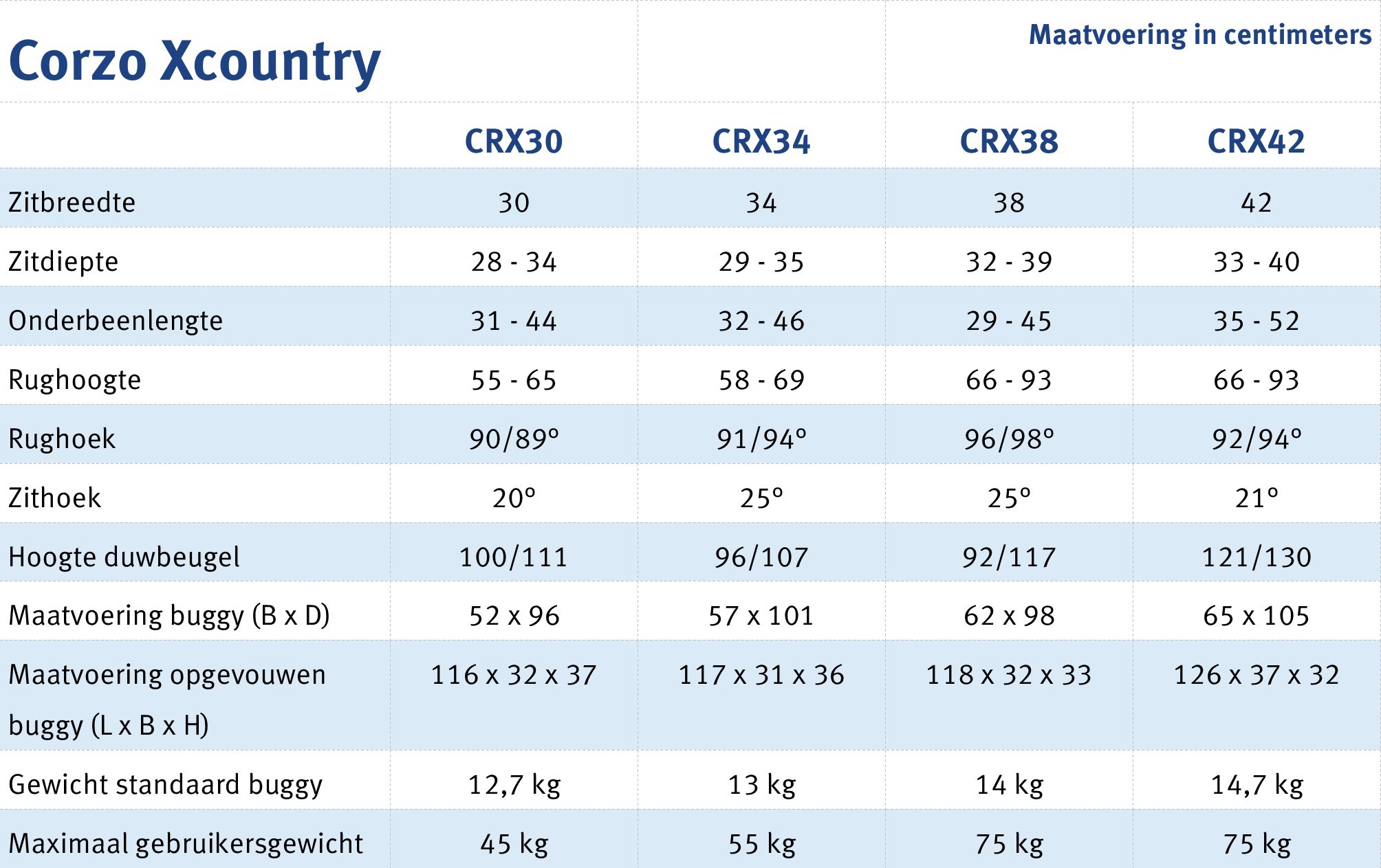 Deze buggy kan een lichaamsgewicht tot maar liefst 75 kg dragen en is uit te rusten met zeer veel accessoires. De Corzo Xcountry is verkrijgbaar in een viertal breedtematen; 30, 34,38 en 42 cm.