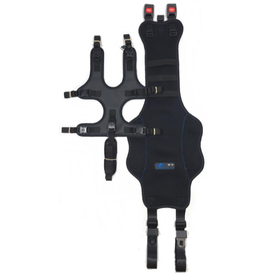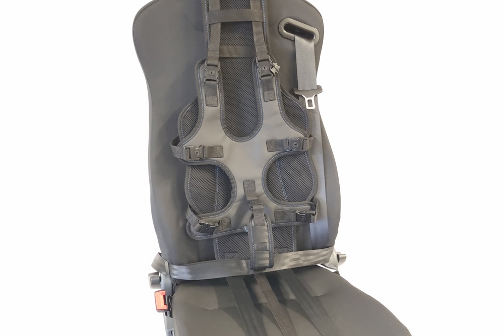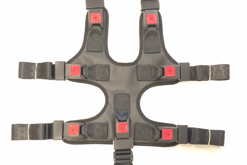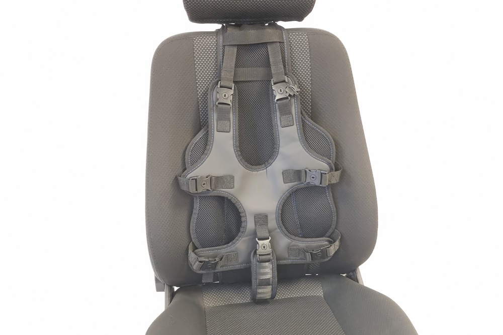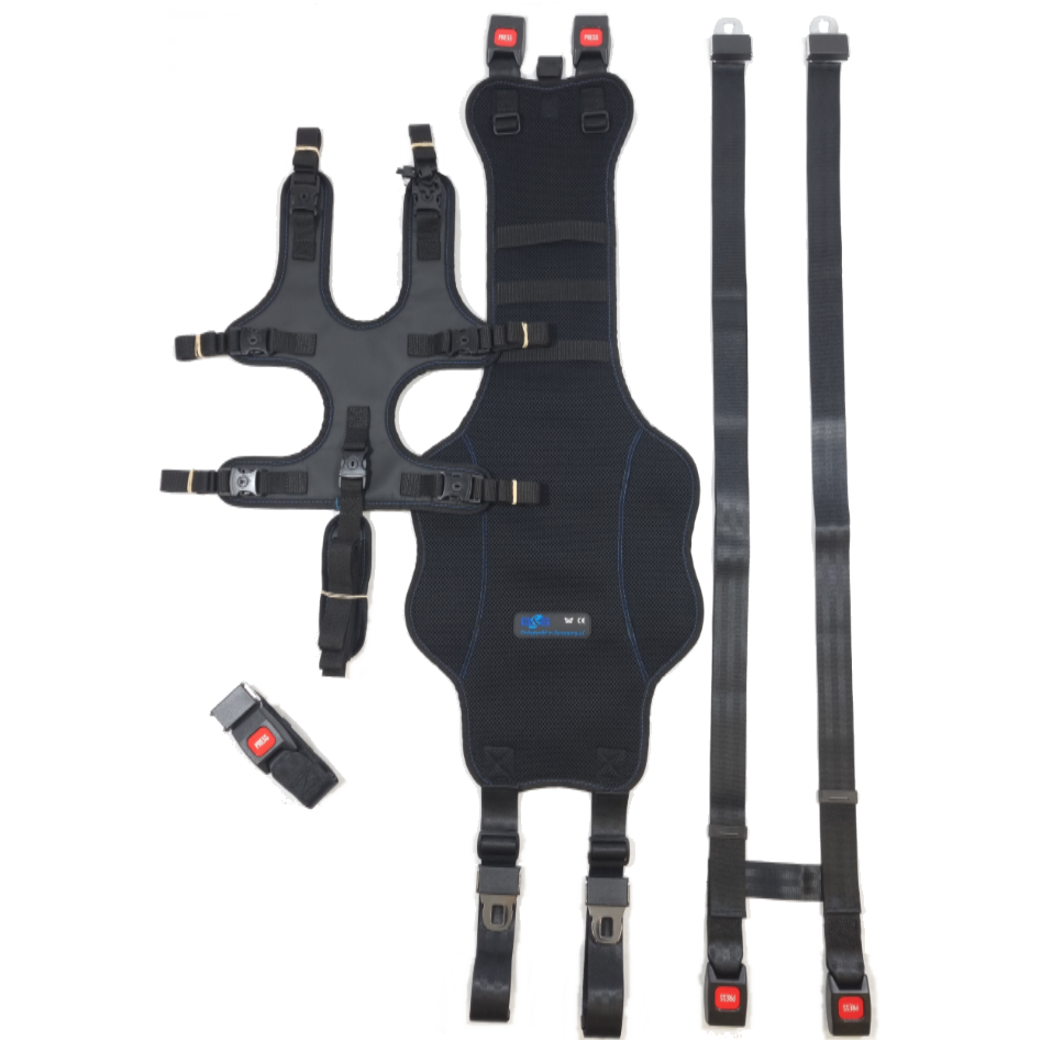 Het kind wordt op 7 punten vastgezet d.m.v. het universele fixatievestje dat aan de basisband met steekgespen geklikt wordt. Indien het punt tussen de benen niet gewenst is kan dit eenvoudig verwijderd worden. Het systeem is ook te gebruiken met een zitverhoger zonder rugleuning.