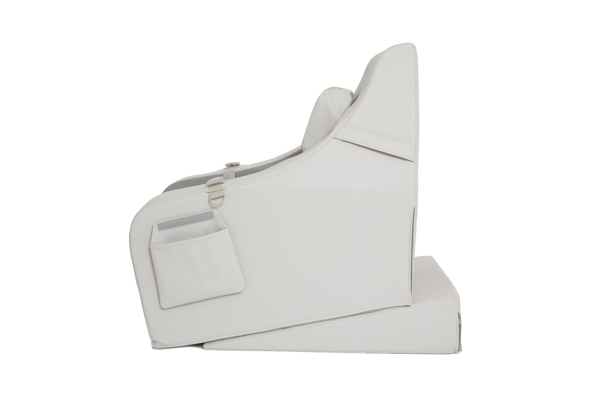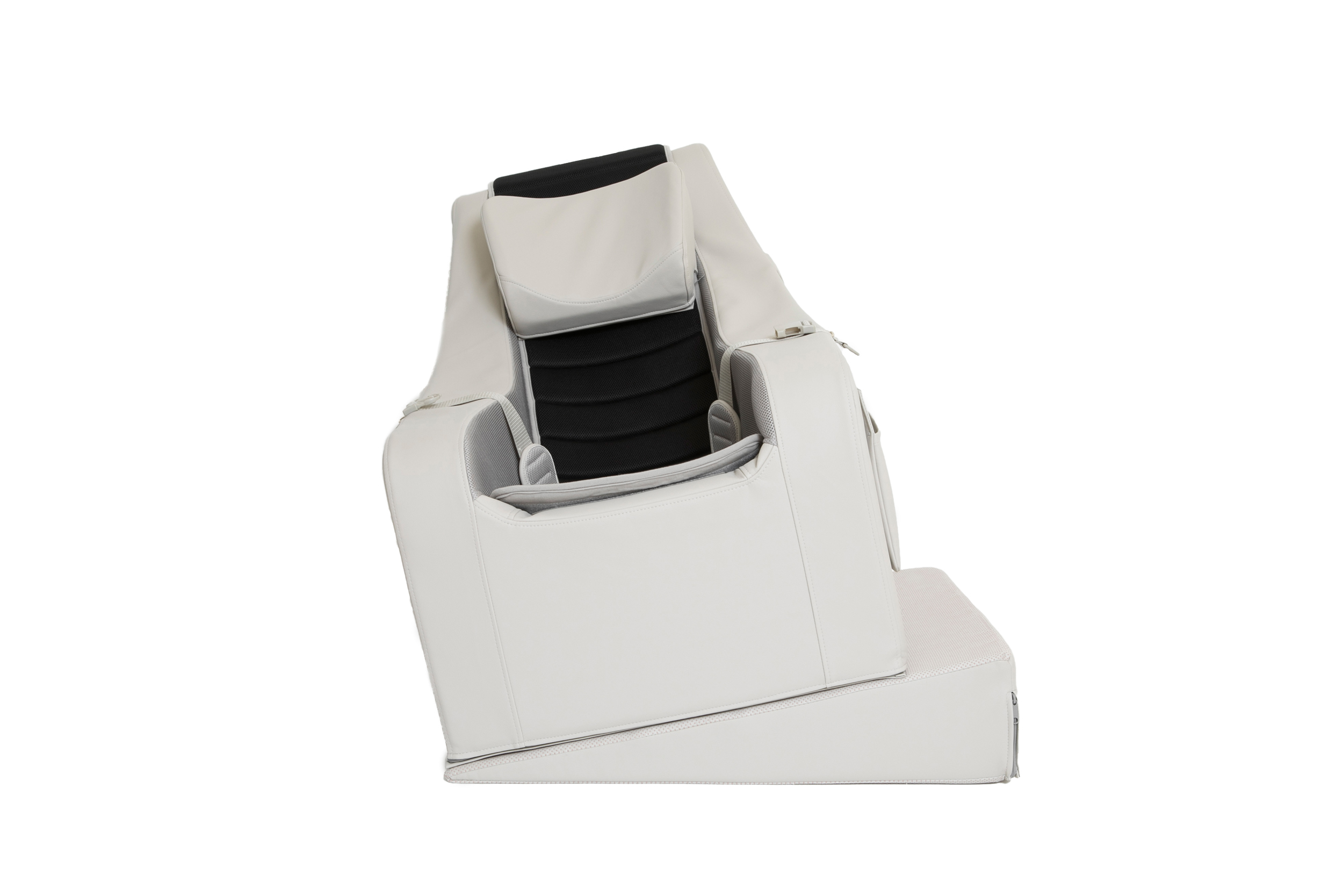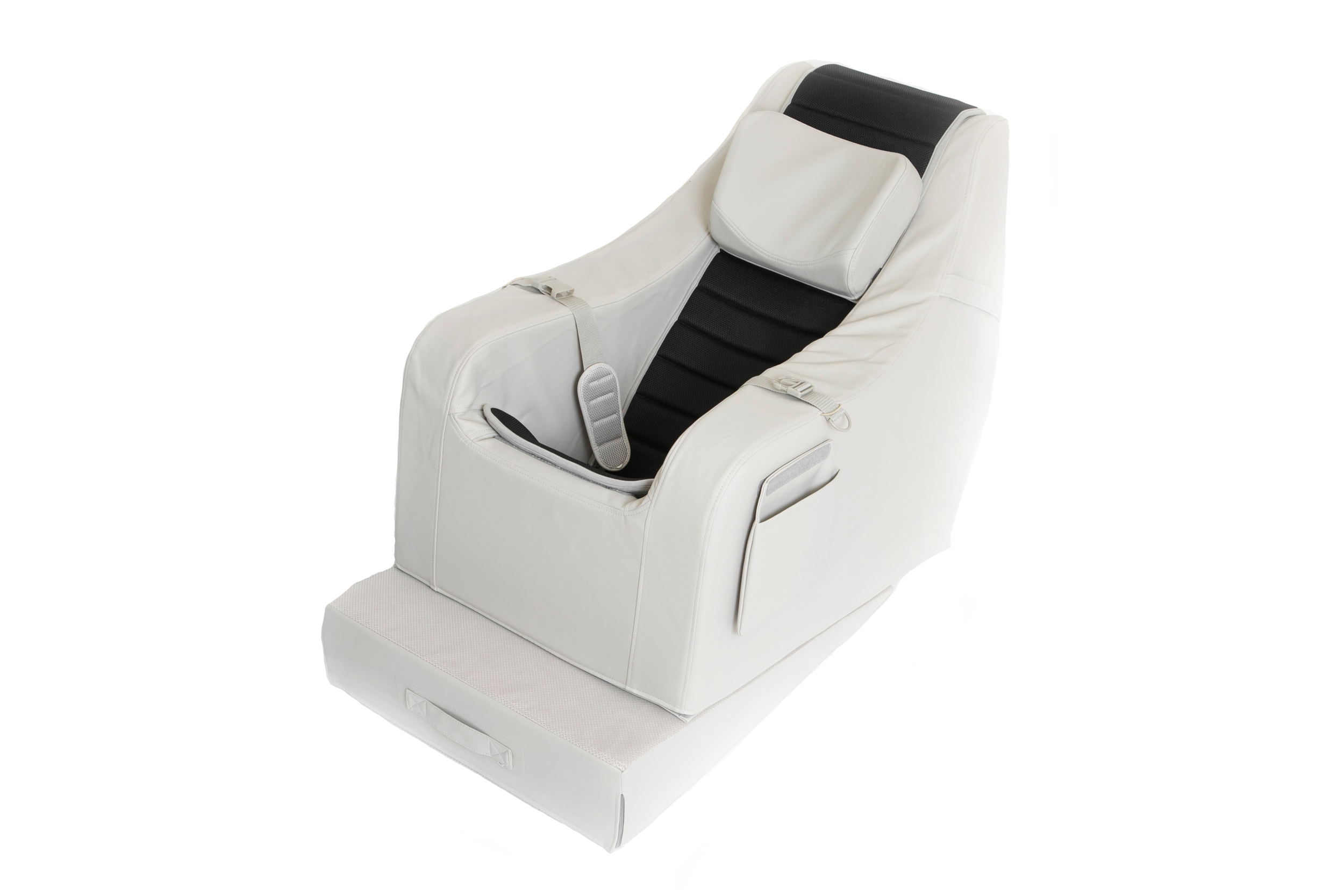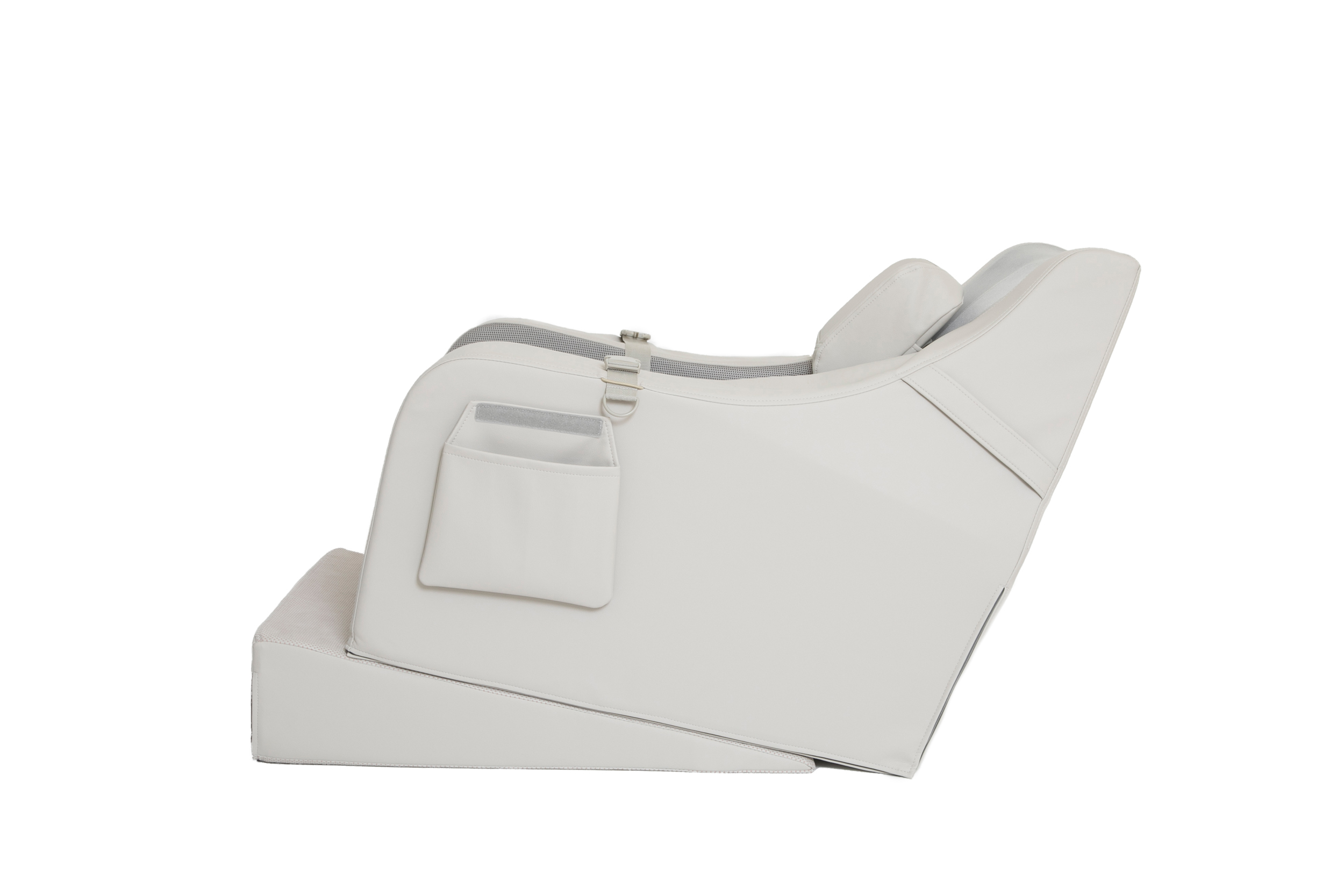 De positie van het hoofd en het lichaam kan nog verder gestabiliseerd worden door het meegeleverde wigkussen. Het wigkussen kan op verschillende manieren onder de stoel geplaatst worden. Klik op de afbeelding links en zie de vele mogelijkheden!