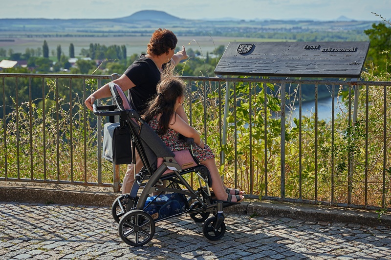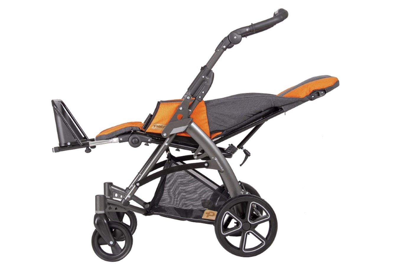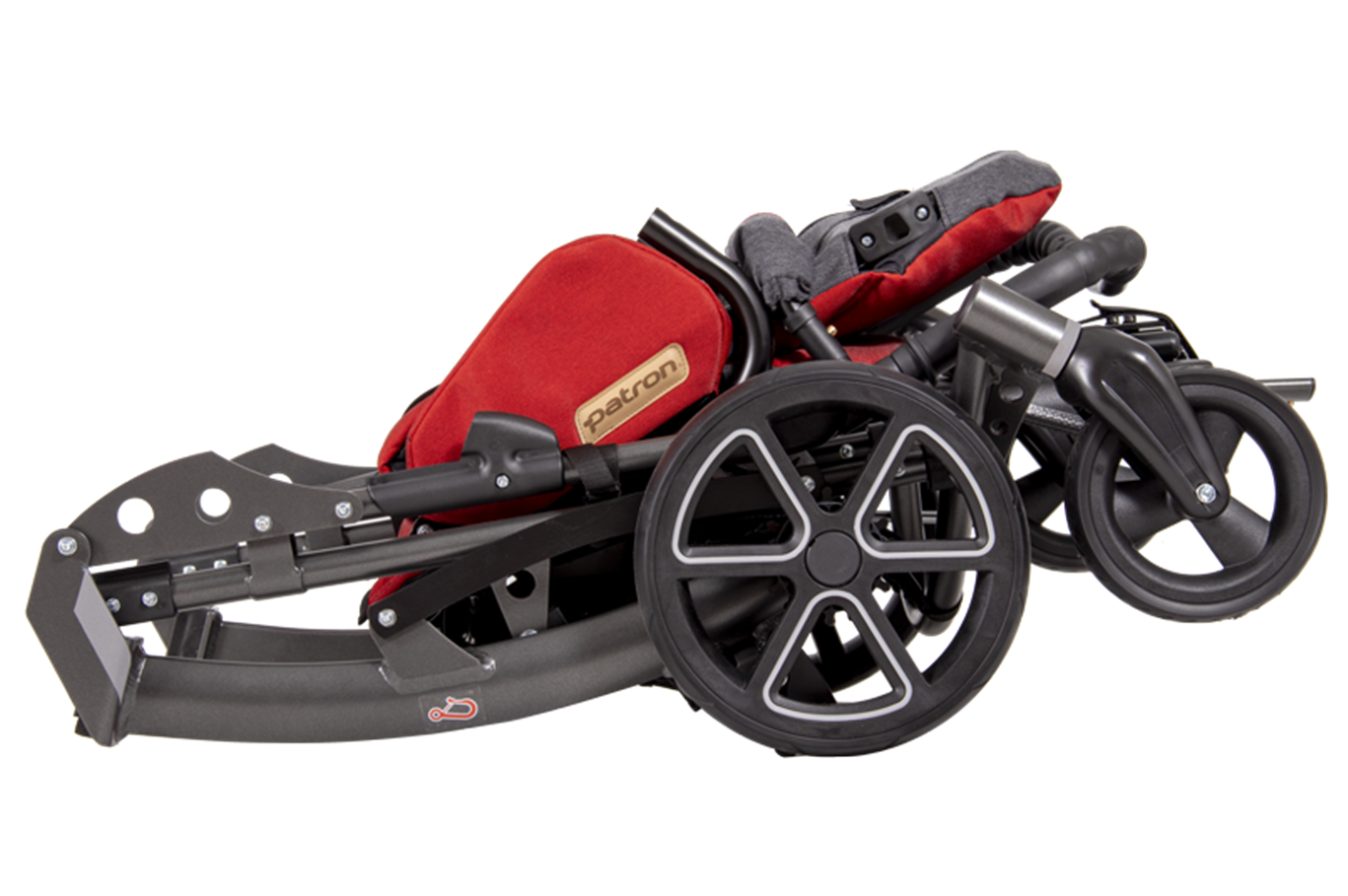 Deze aangepaste wandelwagen is gemakkelijk opvouwbaar en mee te nemen in de kofferbak van een auto.