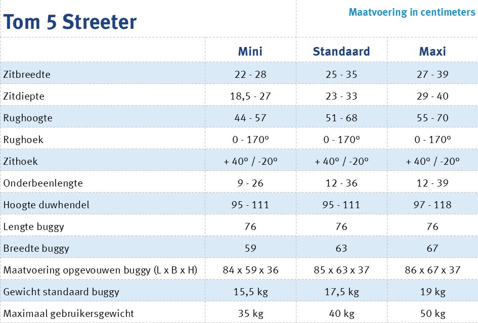 Deze wandelwagen is vervaardigd uit aluminium en daarmee zeer licht van gewicht; 15,5 kg (Mini). De Tom 5 Streeter kan een lichaamsgewicht tot 50 kg dragen en is uit te rusten met zeer veel accessoires. De Streeter is verkrijgbaar in een drietal breedtematen; Mini, Standaard en Maxi. Deze buggy is voorzien van gewatteerde, volledig afneembare bekleding en verkrijgbaar in diverse kleurstellingen.