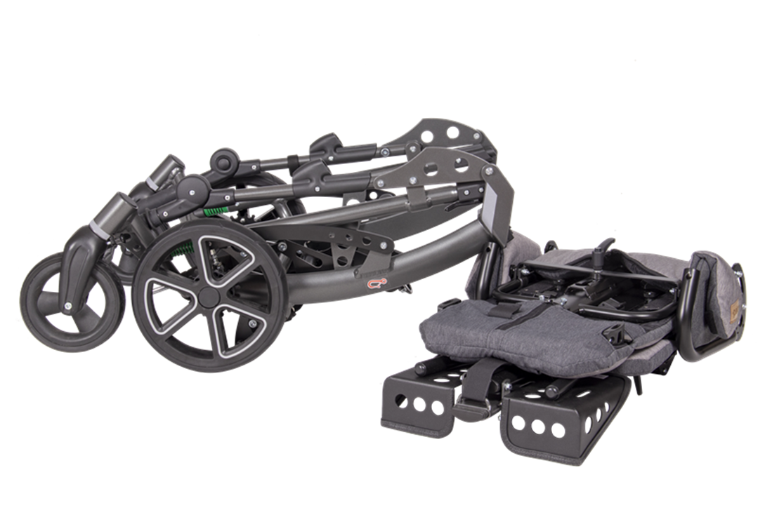 De Tom 5 Streeter is eenvoudig opvouwbaar. De zitunit kan zowel gedemonteerd, als gemonteerd opgevouwen worden. Dit maakt een bezoekje aan de stad, het pretpark, het ziekenhuis mogelijk met deze wandelwagen.